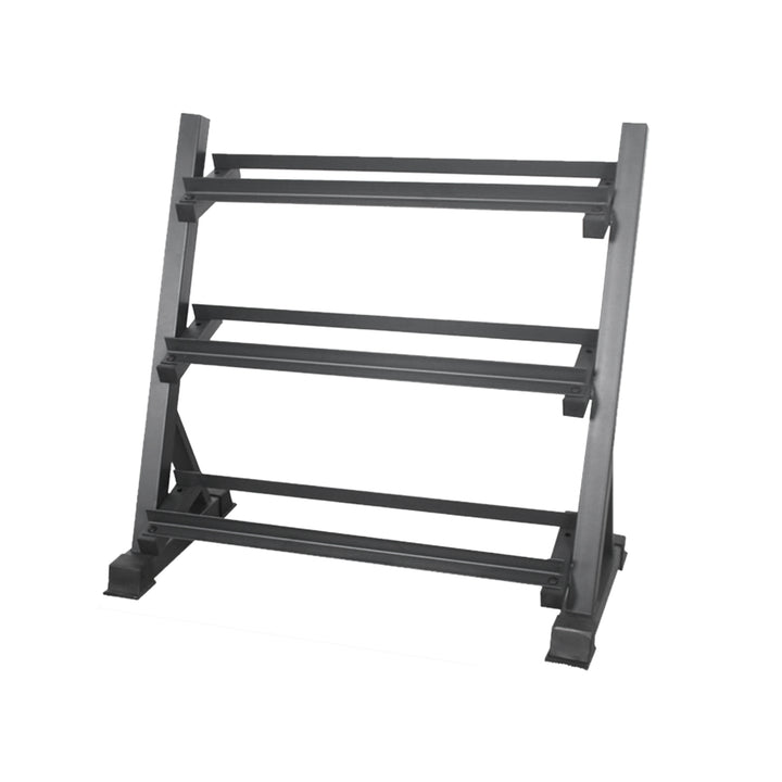 Keep your gym organized with this sturdy 3-tier storage rack. Designed to hold dumbbells and barbells securely, it maximizes vertical space while keeping equipment accessible.