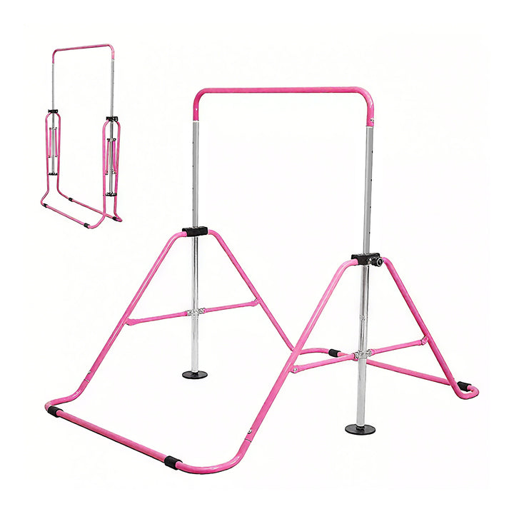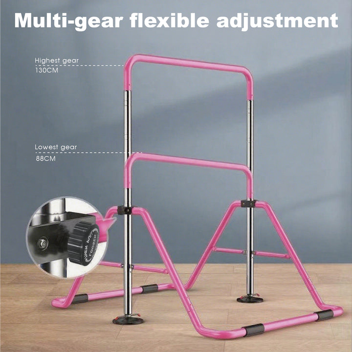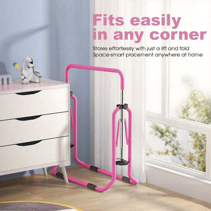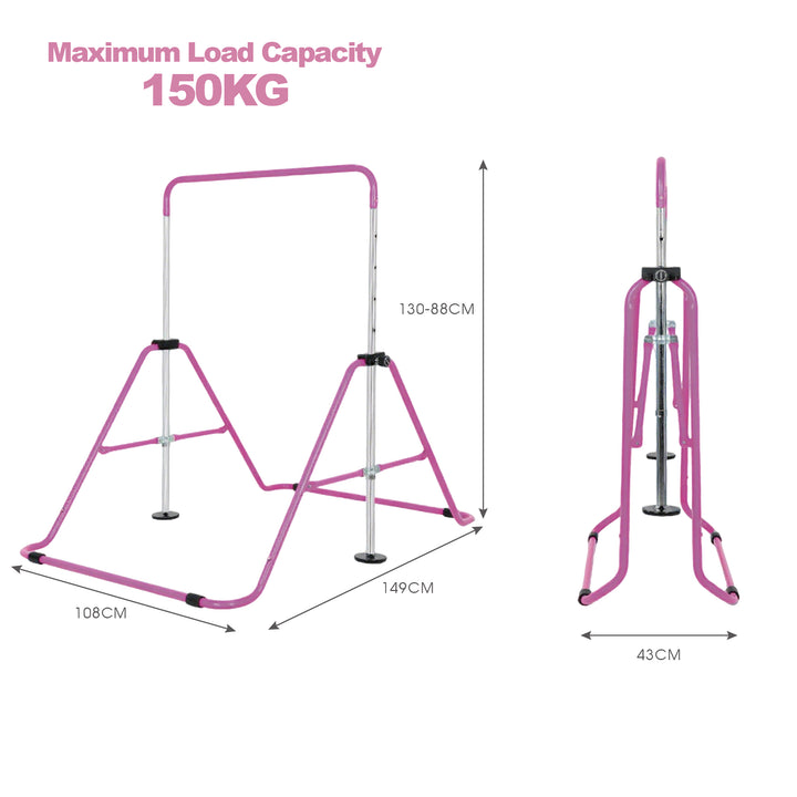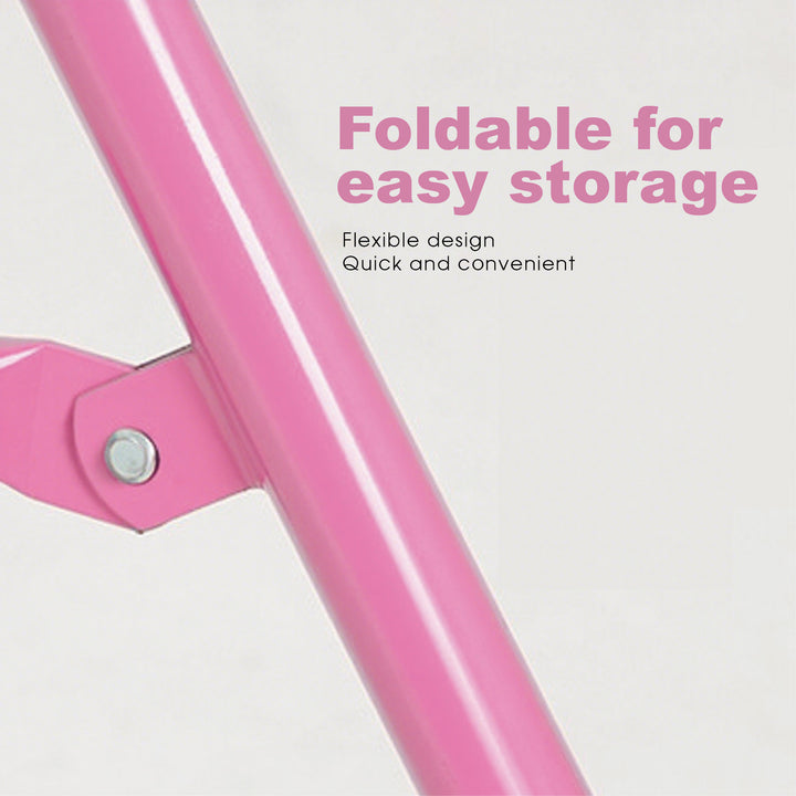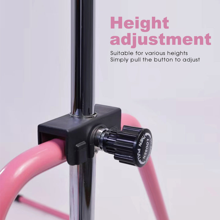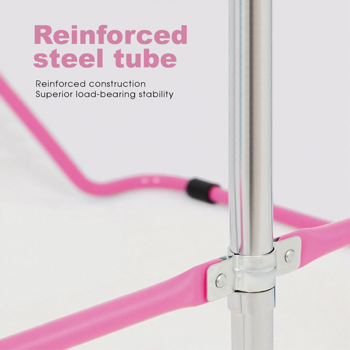 * Adjustable Height: 88cm to 130cm (34.6” to 51.2”) - Color: Pink frame with silver supports.