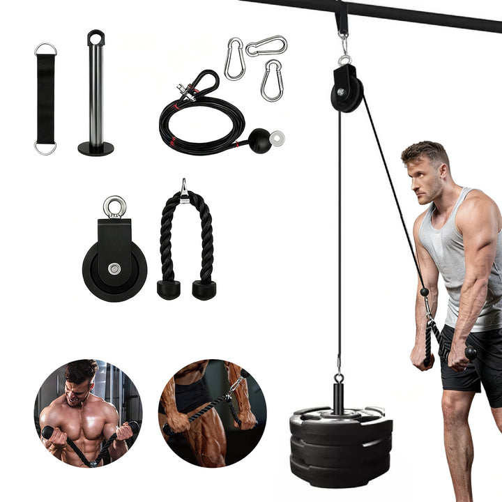 Full 6-Piece Workout Kit: Everything you need—pulley, cable, tray, tricep rope, safety strap, and carabiners—for high-lat pulldowns, tricep extensions, and cable crossovers.