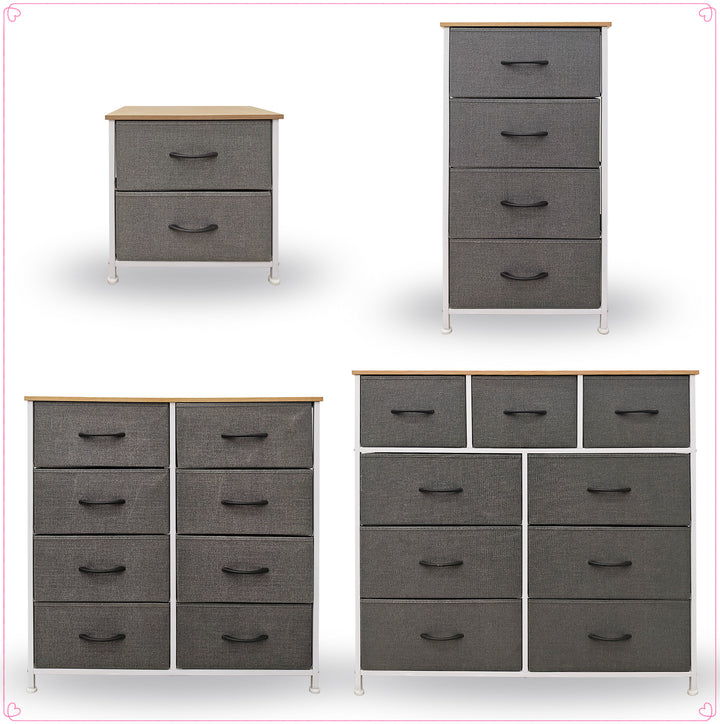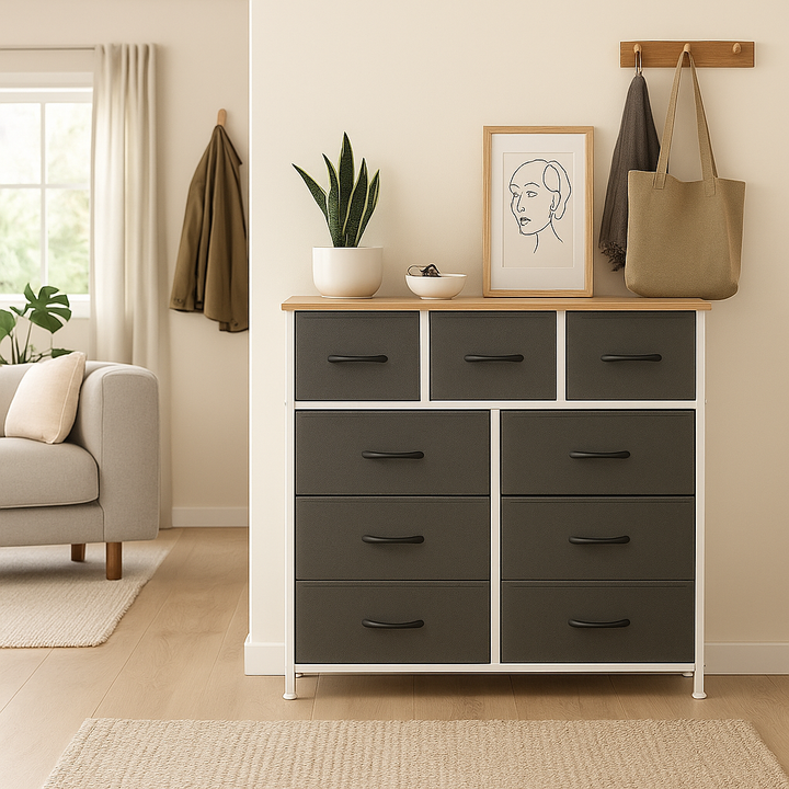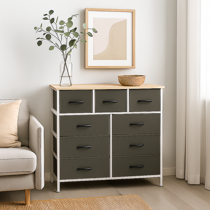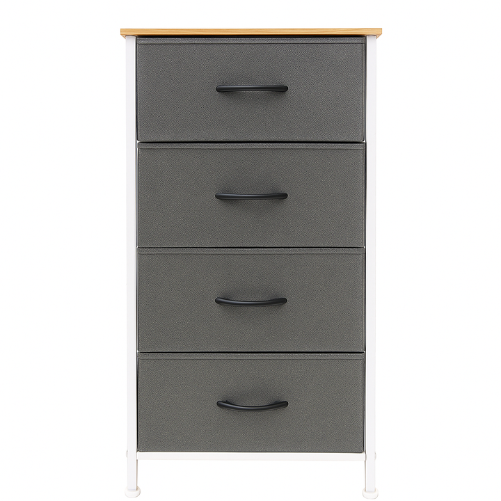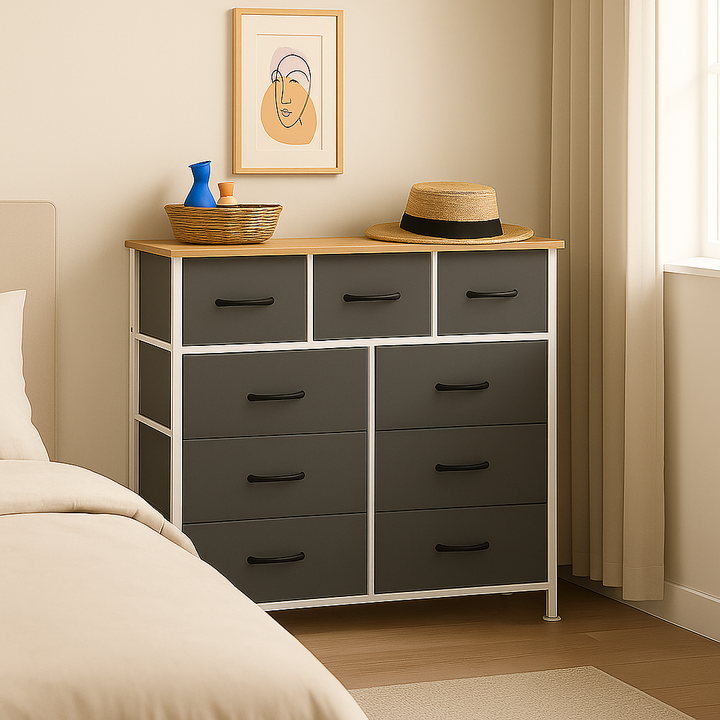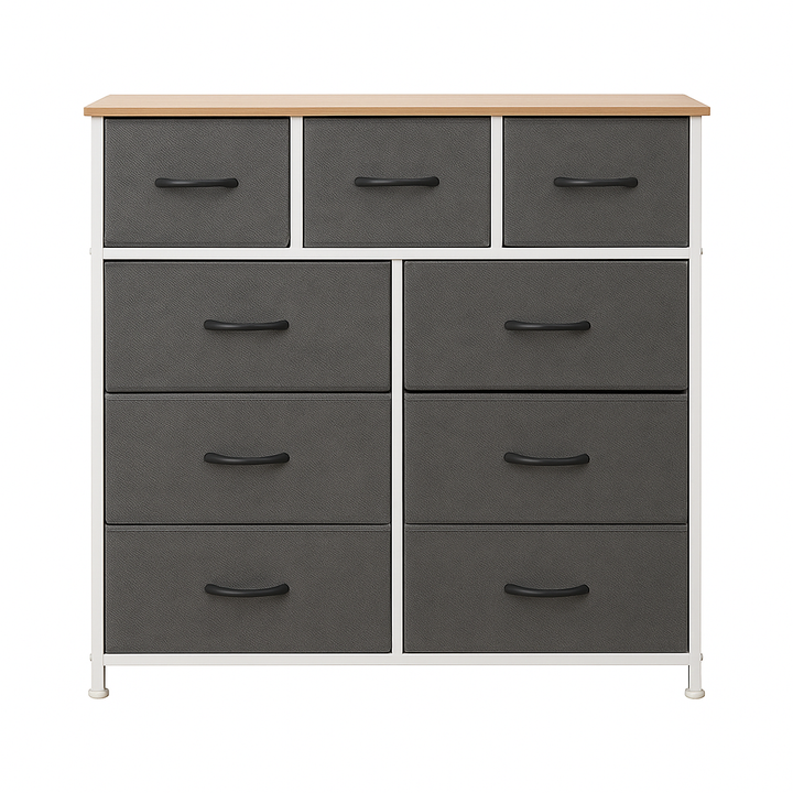 Simplify your space with this sleek drawer dresser, combining eco-friendly gray non-woven fabric drawers, a durable white powder-coated metal frame, and a natural wood-toned top. Perfect for bedrooms, entryways, or small apartments, this minimalist organizer offers functional storage, sustainable materials, and timeless design-keeping your essentials tidy, dust-free, and stylishly accessible.