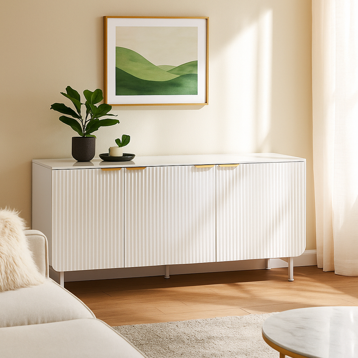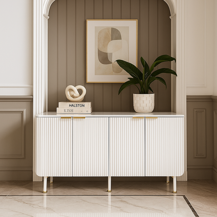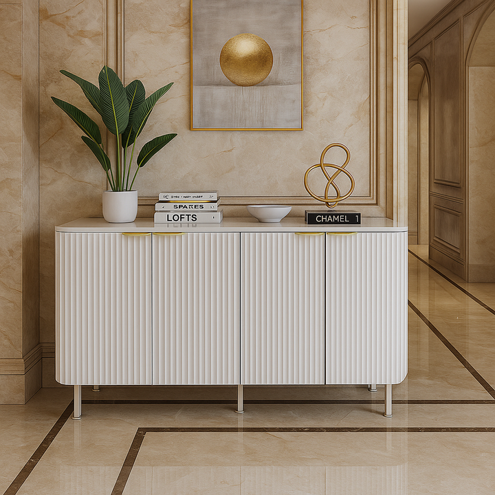 Upgrade your dining room or living space with our elegant 4-Door Buffet Cabinet, designed in a Scandinavian-inspired style with high-gloss white finish and luxurious gold handles. This modern yet functional storage piece combines sleek aesthetics with practical storage solutions, making it a perfect addition to any contemporary home.
