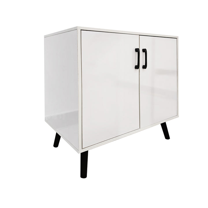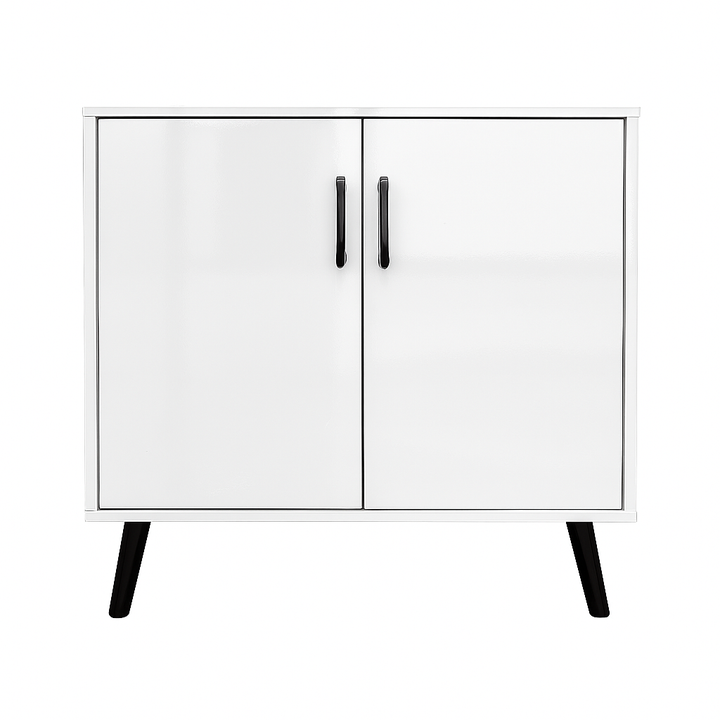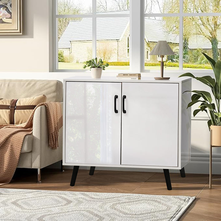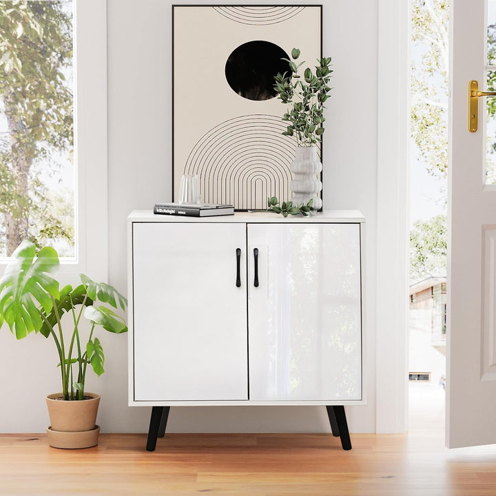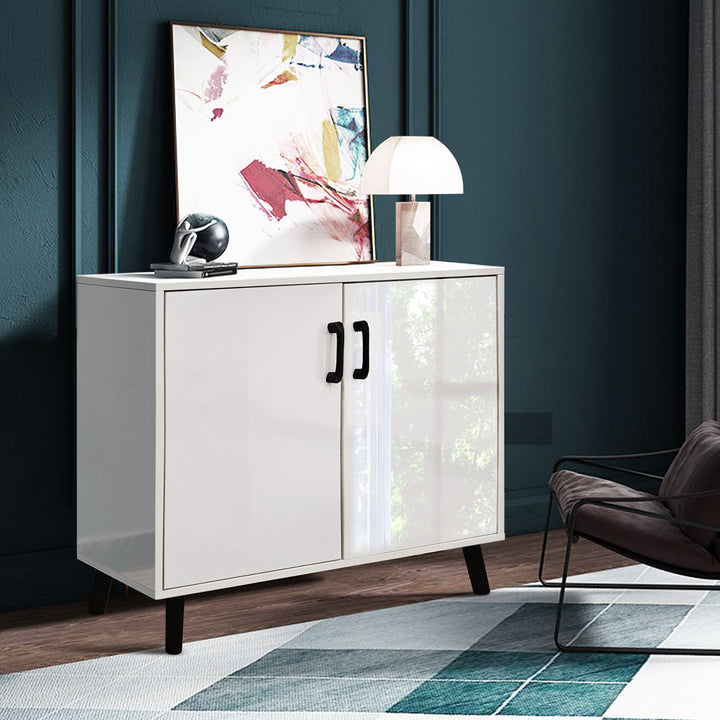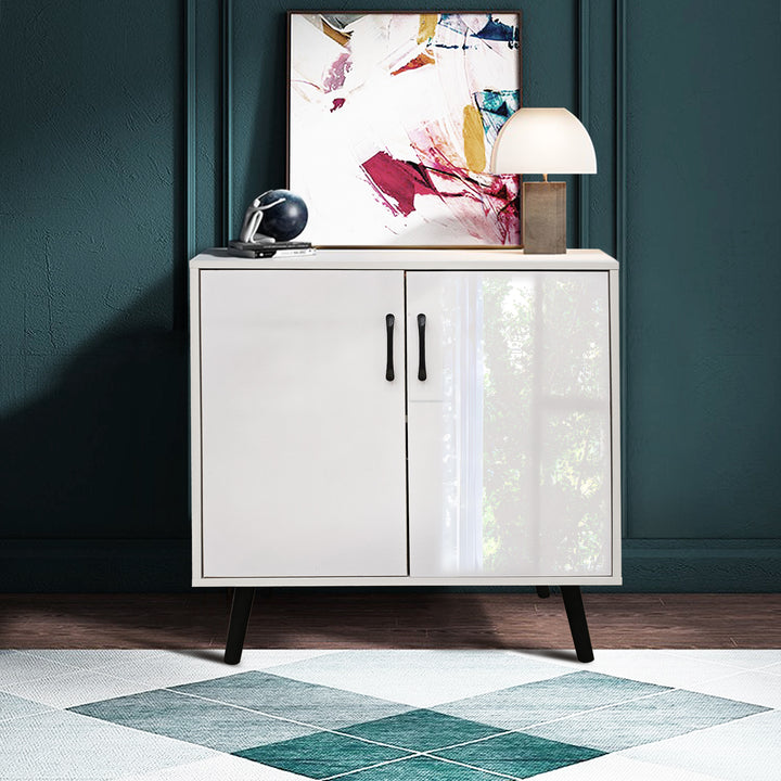 Elevate your home décor with our sleek white high-gloss 2-door buffet cabinet, featuring bold black handles and legs for a striking modern contrast. Designed with Scandinavian simplicity in mind, this stylish storage piece blends minimalist elegance with practical functionality—perfect for dining rooms, living spaces, or entryways.