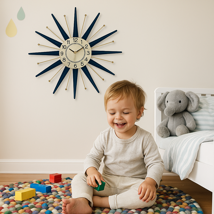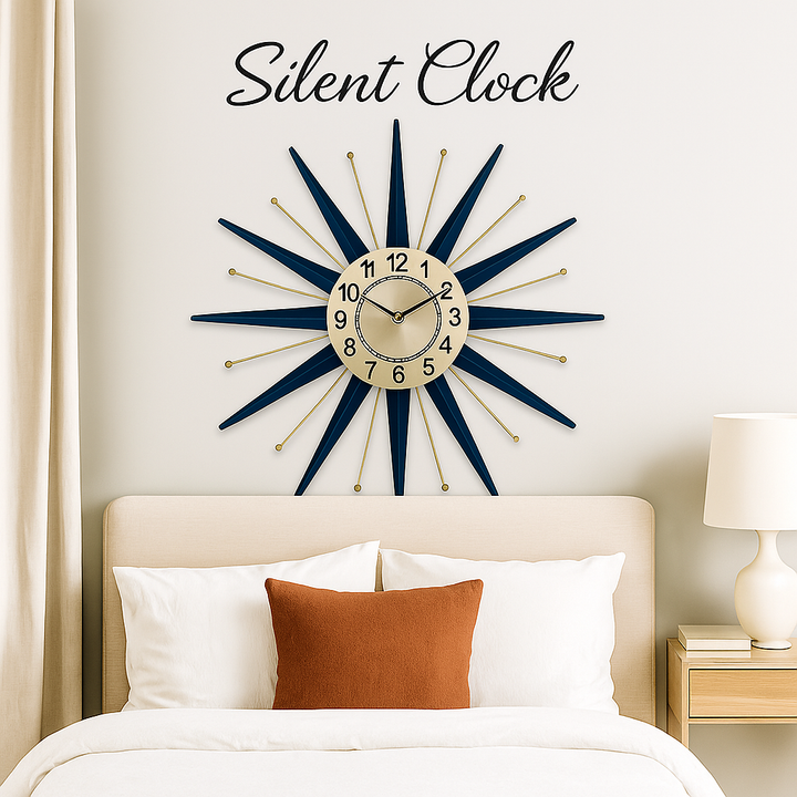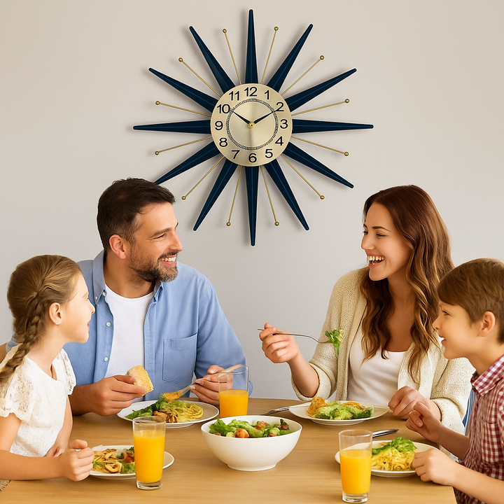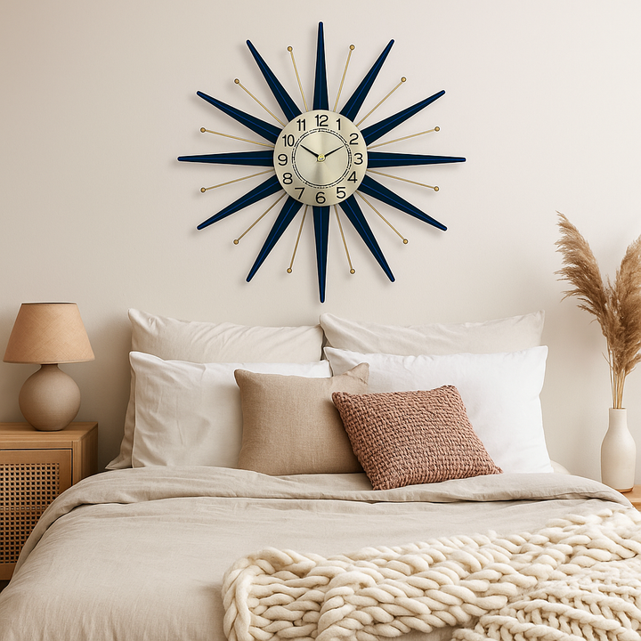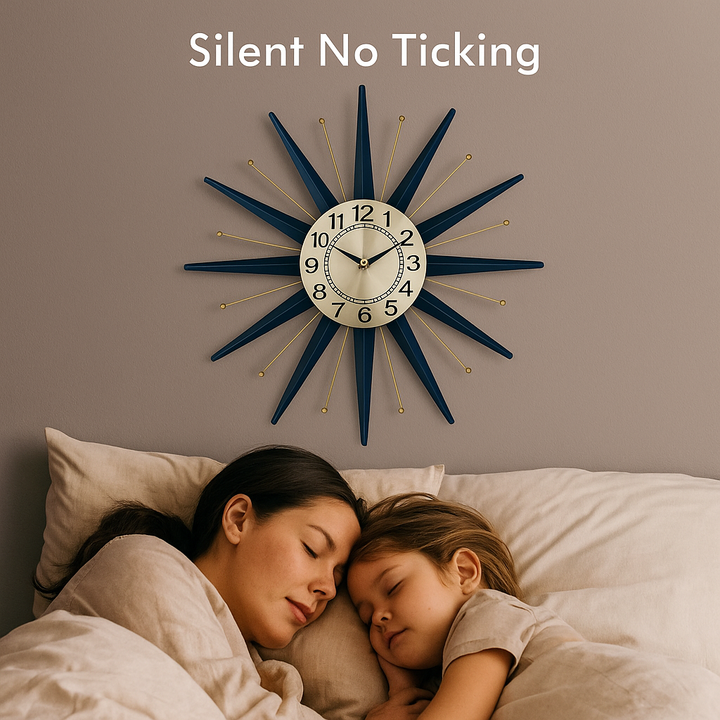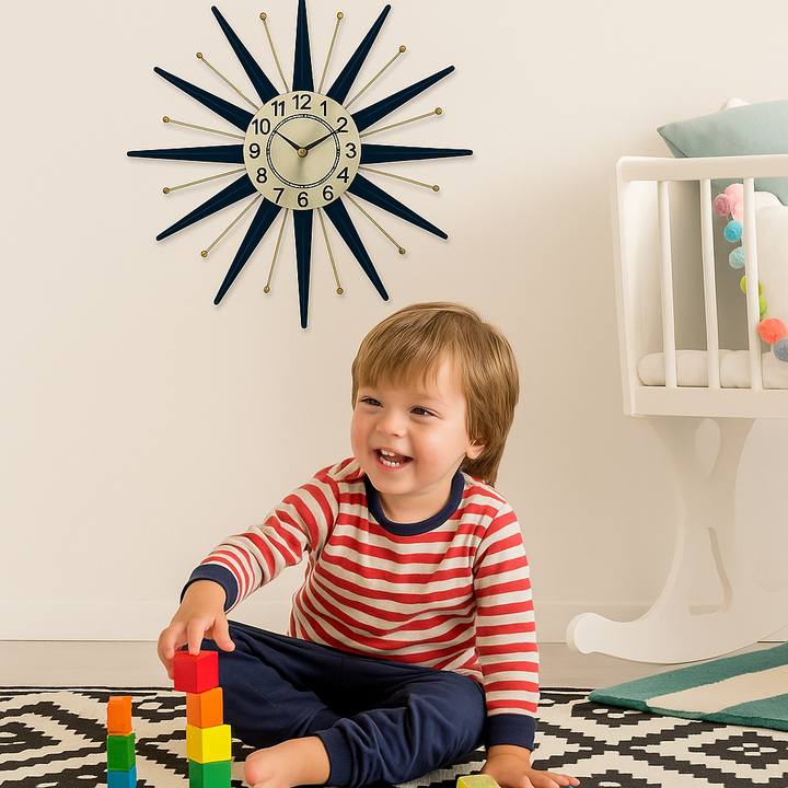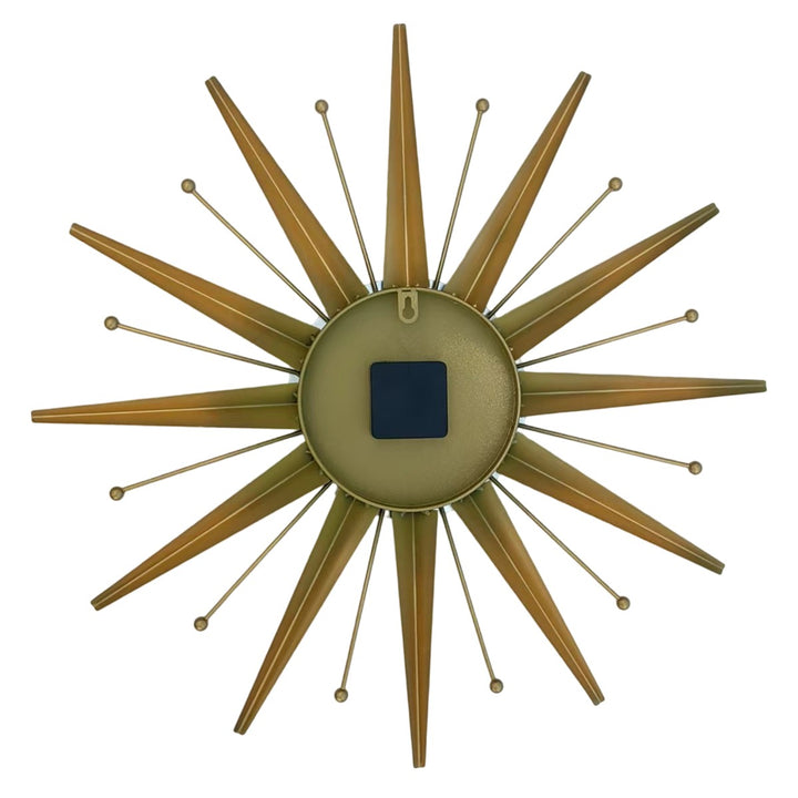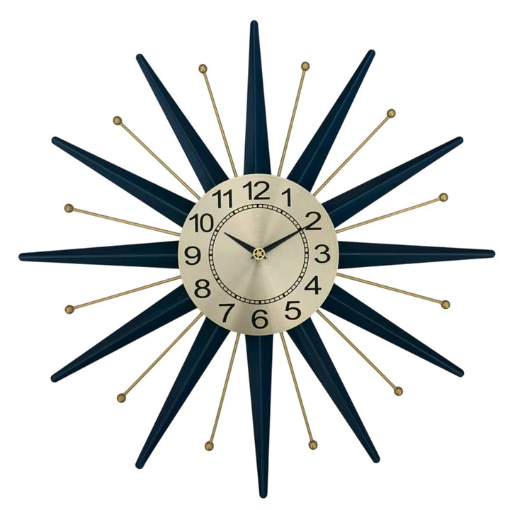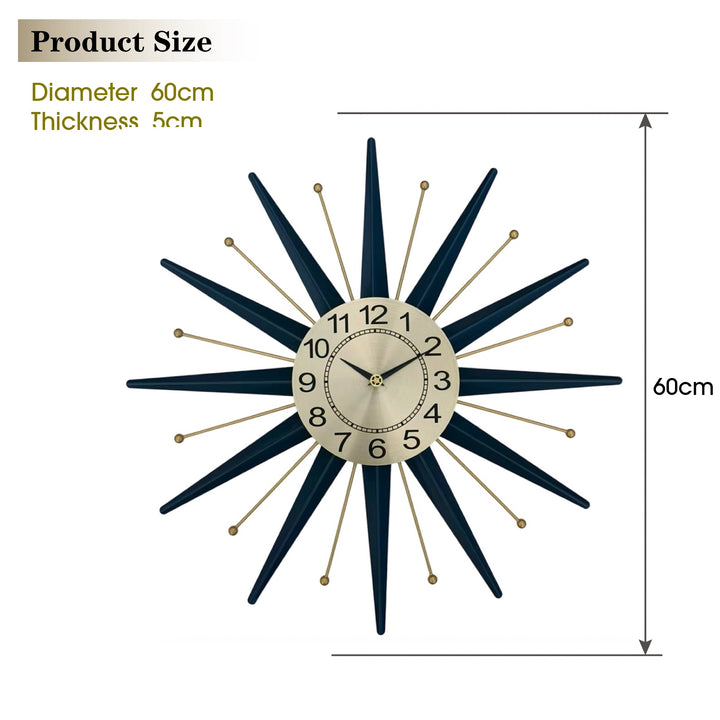 - Stylish Retro Design – Inspired by mid-century sunburst aesthetics, this statement wall clock combines black rays with gold accents for a timeless and elegant look.